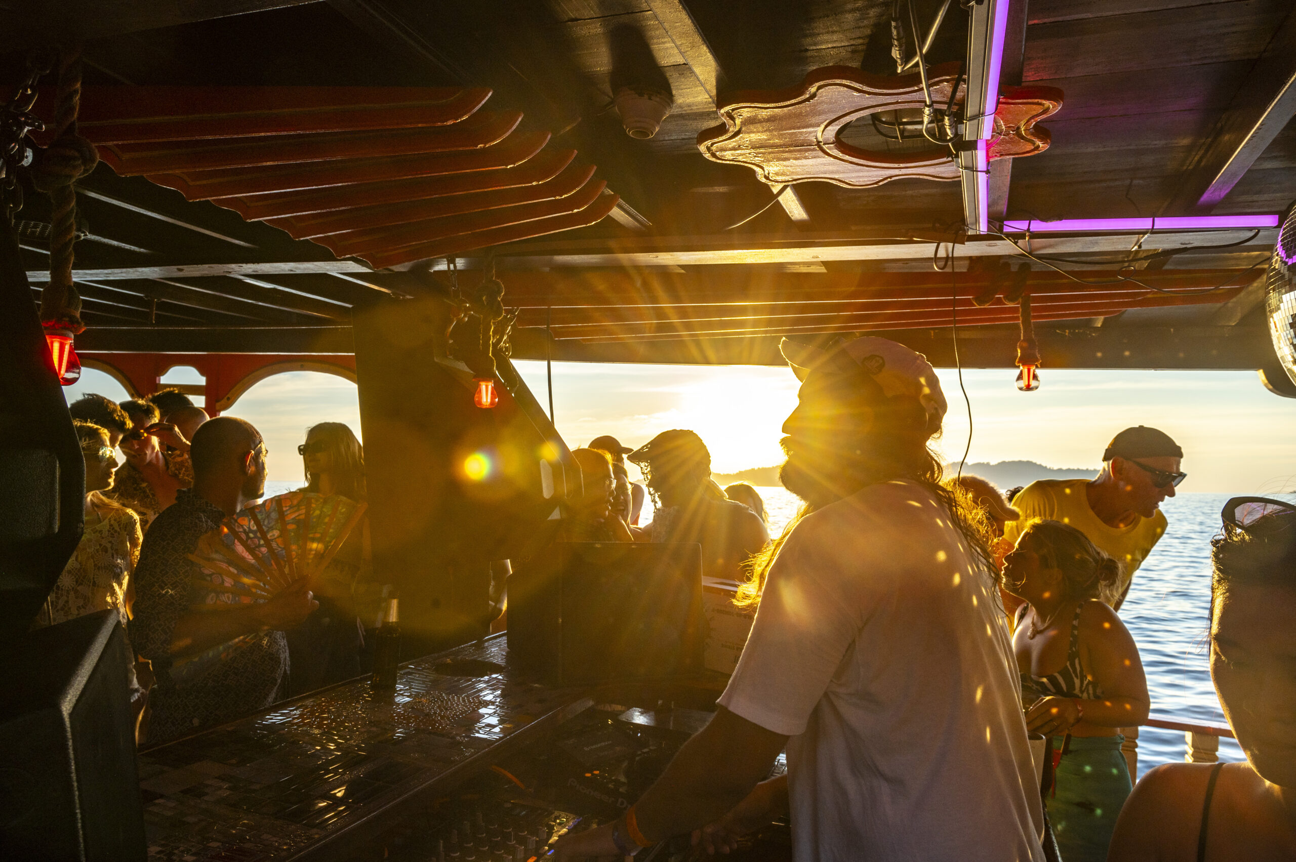 Next in the decks was another top Thai DJ, Pam Anantr, who kept the thronging crowds bouncing for the duration of her set with ease. Then came the final set, which landed with French artist Richard Fribert, who switched up the vibe with each passing track. Keeping the crowd on their toes, he dipped between upbeat house, squelchy acid, and disco weapons that kept the crowd guessing, but most importantly, grooving for the duration. The music alone was enough, but the super-friendly crowd was perhaps one of the most important factors. This would be a constant throughout the festival, but sharing this special party with people from all over the world who had made the trip to this paradise with one thing in mind, and that was to have fun. There was, of course, the stunning scenery, and when the boat stopped so people could jump off the top deck into the pristine bluey blue-green waters below, this friendly atmosphere seemed to effortlessly jump up a notch at that point. With each person getting graded on their jumps and dives, this afternoon on the seas would set the tone for the rest of the festival.