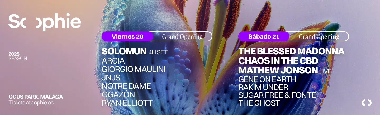 Leading the bill is Solomun, returning for a four-hour set following his notable closing performance at Sophie 2024. Joining him is The Blessed Madonna making her Malaga debut. Chaos In The CBD will also perform, presenting their new album, ‘A Deeper Life’, as part of their global tour. For those seeking a more raw, improvised sound, the legendary producer Mathew Jonson will deliver a live analog techno set.