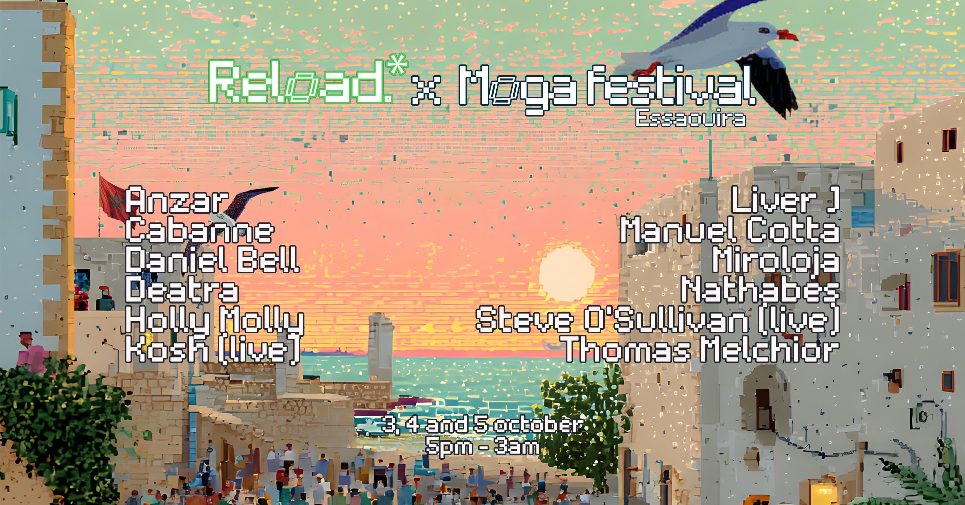 Reload’s scheduling within MOGA Festival means it’s more than just another stage; it’s a curated space where electronic music’s lineage and future meet in Essaouira’s evocative setting: wind-blown ocean air, ancient medina walls, and the open skies of Morocco.